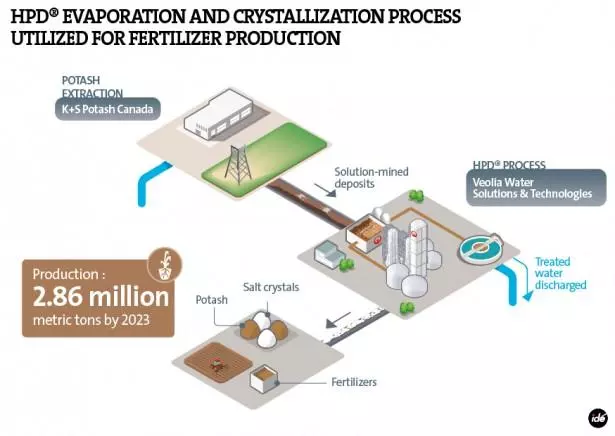 A few months after Spanish company Iberpotash, K+S Potash Canada, a subsidiary of Germany's K+S Group, one of the world's leading salt and fertilizer producers, selected Veolia to develop engineering for the mineral treatment facility at its new Legacy Project potash mine. Located in the south of the Canadian province of Saskatchewan, the facility is expected to begin production in late 2015 and will be one of the biggest plants of its kind in North America. Veolia's solution will enable K+S Potash Canada to produce 2.86 million metric tons per year of potash by 2023 through evaporation and crystallization of solution-mined material.